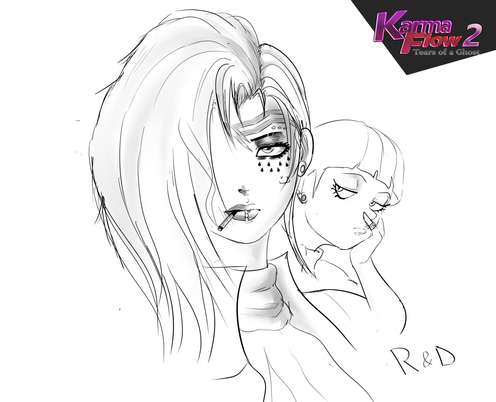 Sketch I made showing two of my OCs. They're RESearch & DEVelopment, two characters from the game I'm currently developing, Karma Flow 2 - Tears of a Ghost